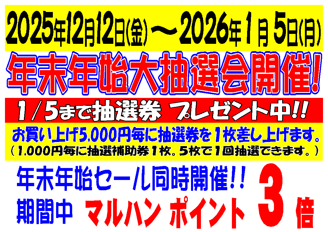 いつもマルハンをご利用いただきありがとうございます。 今年も皆さまへの感謝を込めて、年末年始の特別イベントを開催いたします! 2025年12月12日(金)~2026年1月5日(月)まで 年末年始大抽選会と同時に年末年始セールも開催! ぜひこの機会にマルハンへお越しください。