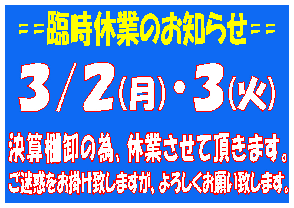 決算棚卸の為、休業させていただきます。